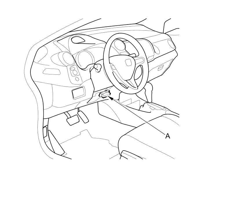 When the Honda Diagnostic System (HDS) is connected to the data link connector (DLC) (A) located under the driver's side of the dashboard and the SCS mode is selected, it will indicate the diagnostic trouble code (DTC) when the ignition switch is turned to ON (II) and the appropriate menu is selected.