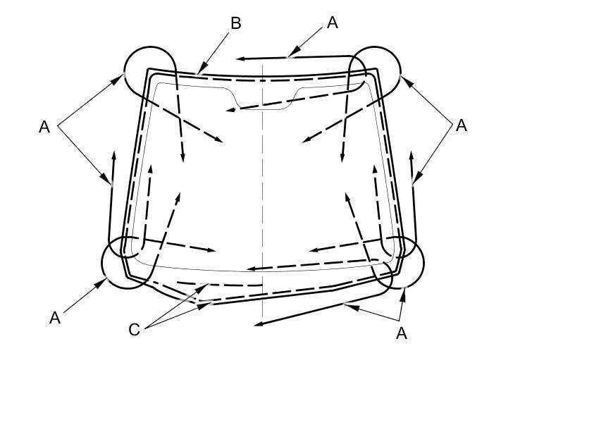 12. Attach a new windshield molding (A) with adhesive tape (B) to the edge of the windshield (C):