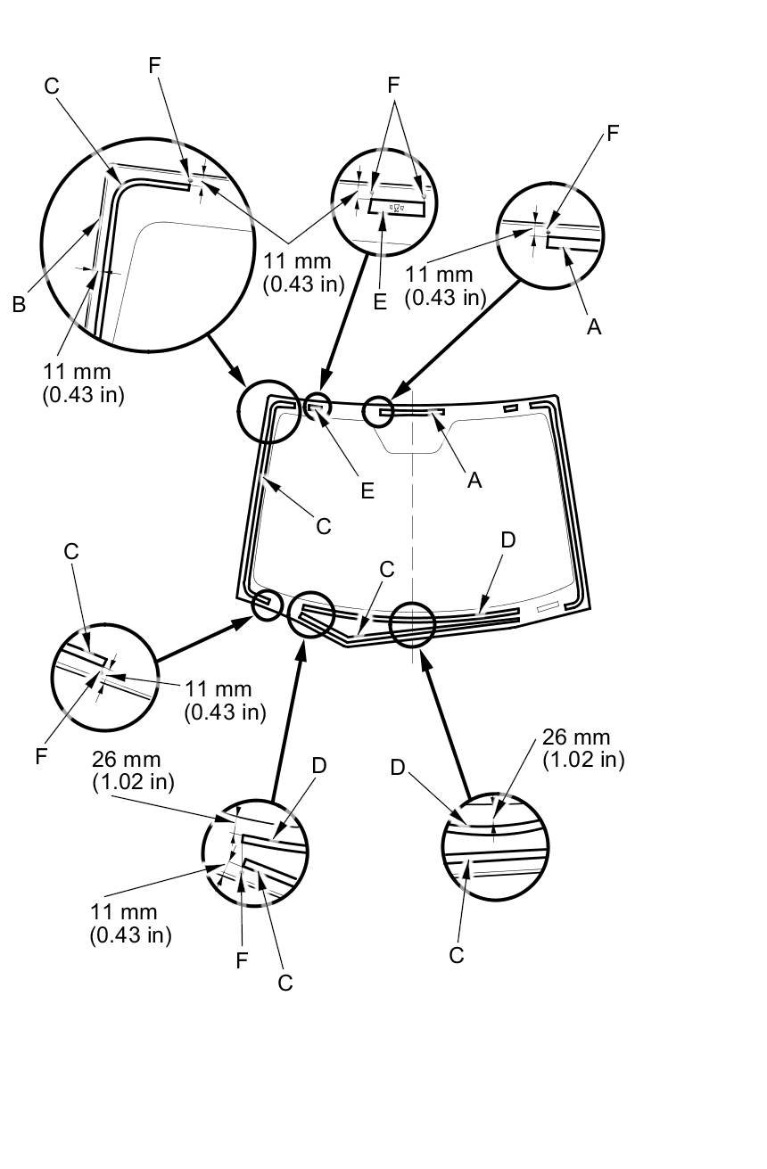 - With the printed dots (D) on the windshield as a guide, apply glass primer to the bottom (E) of the windshield.