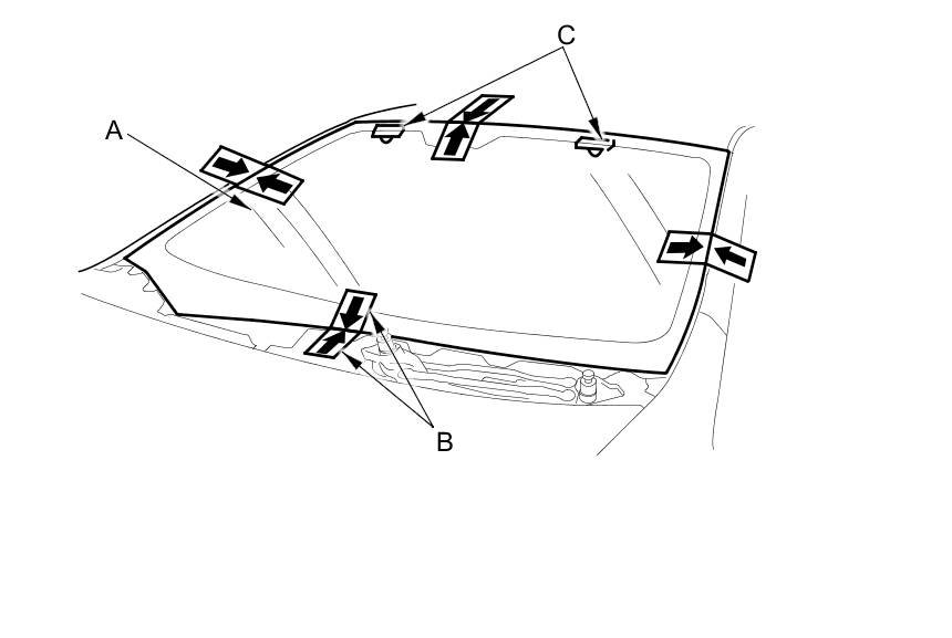 Make alignment marks (B) across the windshield and the body with a grease pencil at the four points shown. Make sure the upper clips (C) contact with the edge of the body holes. Be careful not to touch the windshield where adhesive will be applied.
