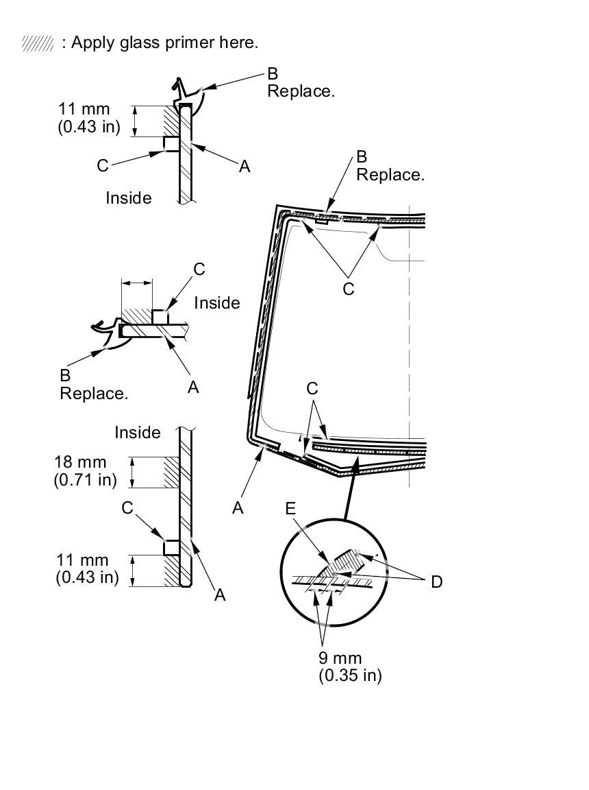 - Apply glass primer to the bottom (E) of the windshield.