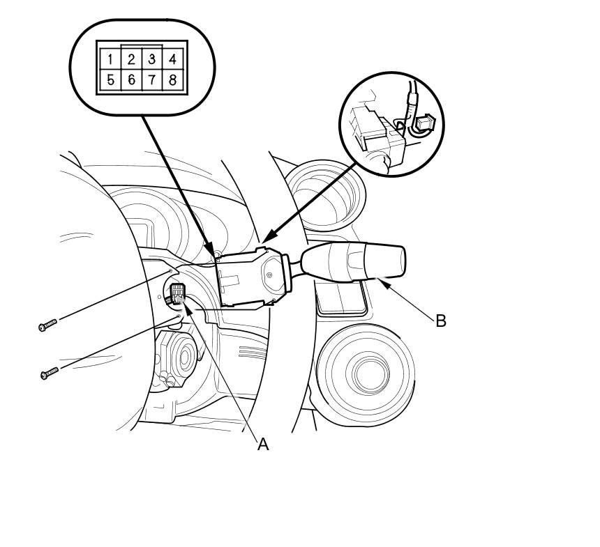 2. Disconnect the dashboard wire harness 8P connector (A) from the wiper/washer switch (B).