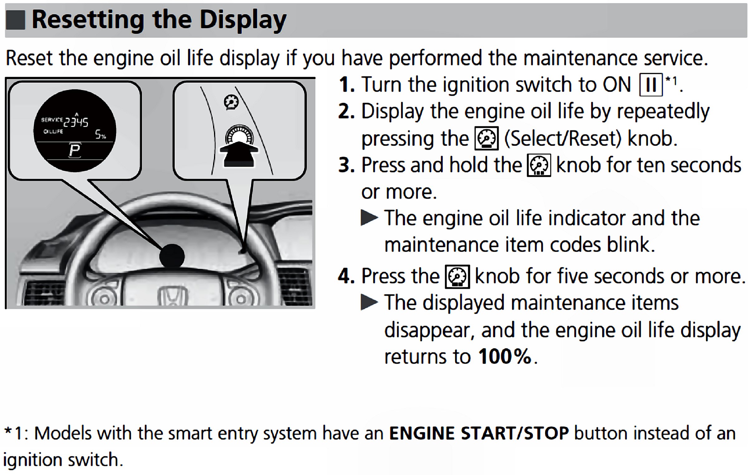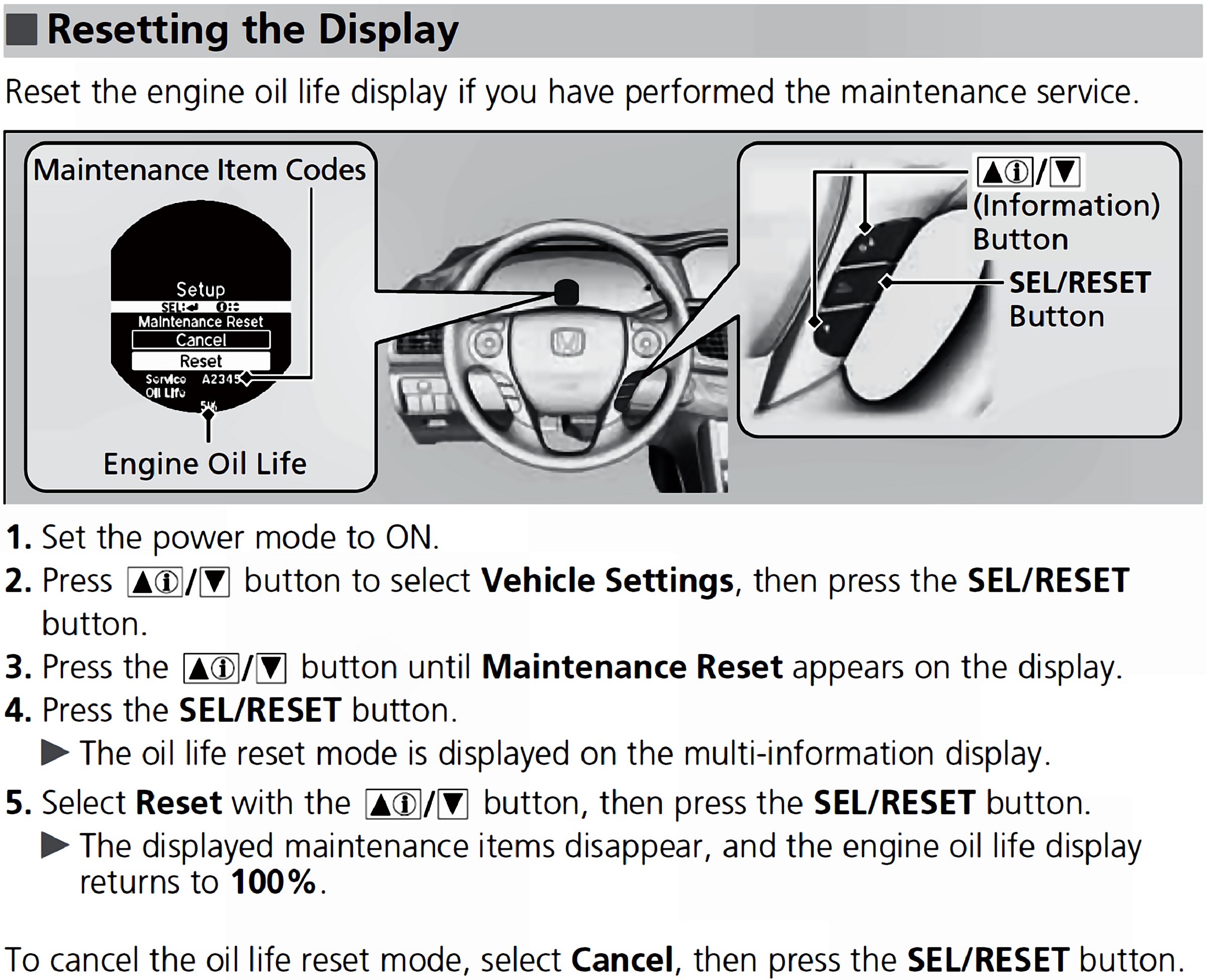 The dealer will reset the engine oil life display after completing the required maintenance service. If someone other than a dealer performs maintenance service, reset the engine oil life display yourself.