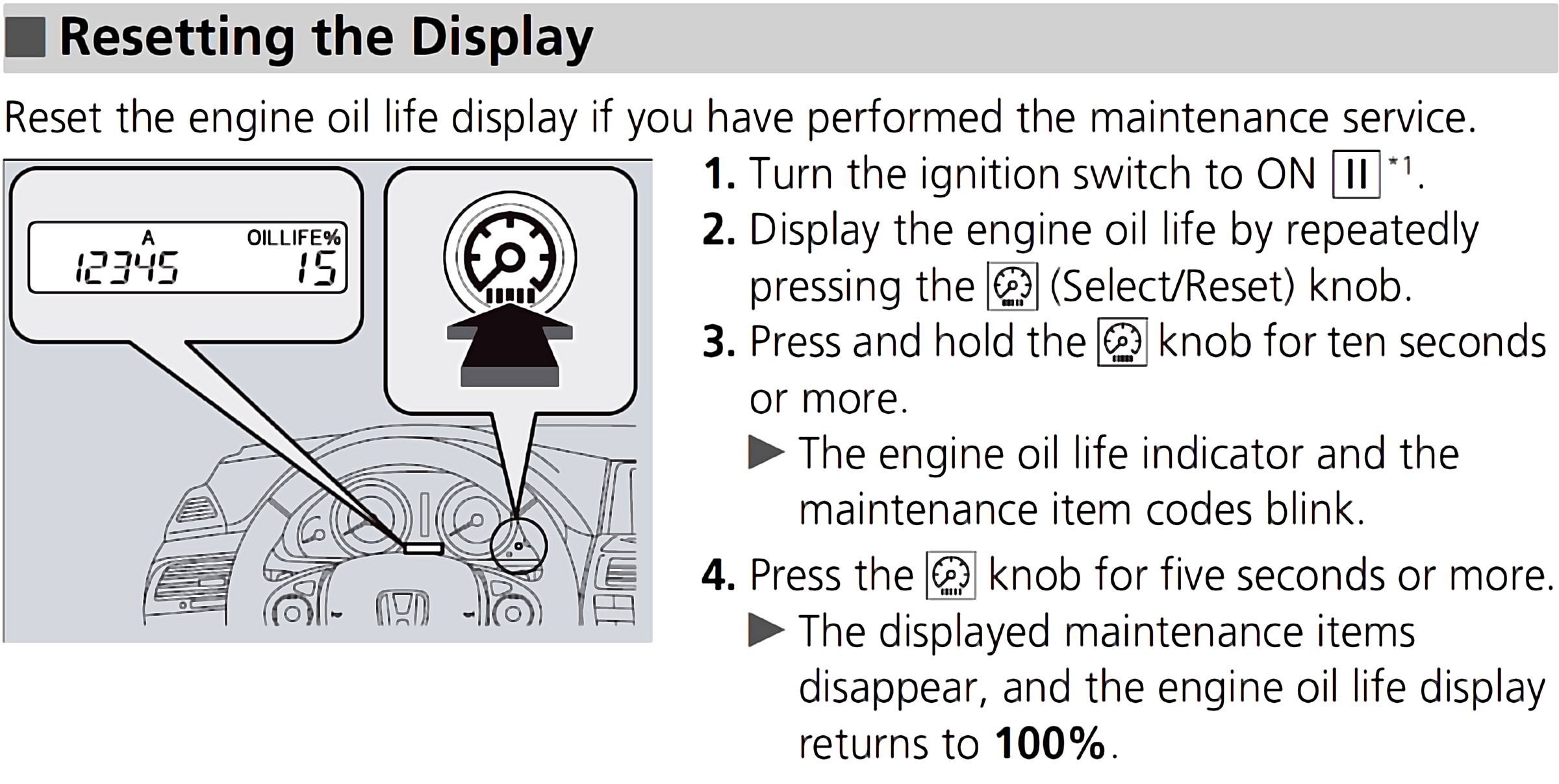 - The dealer will reset the engine oil life display after completing the required maintenance service. If someone other than a dealer performs maintenance service, reset the engine oil life display yourself.
