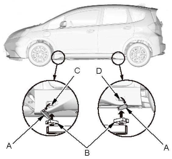 1. Remove the cover (A), then position the lift pads (B) under the vehicle's front support points (C) and rear support points (D).