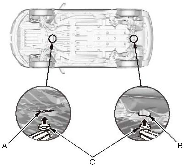 3. Position the floor jack under the front jacking bracket (A) or the rear jacking bracket (B). Center the jacking bracket on the jack lift platform (C), and jack up the vehicle high enough to fit the safety stands under it.