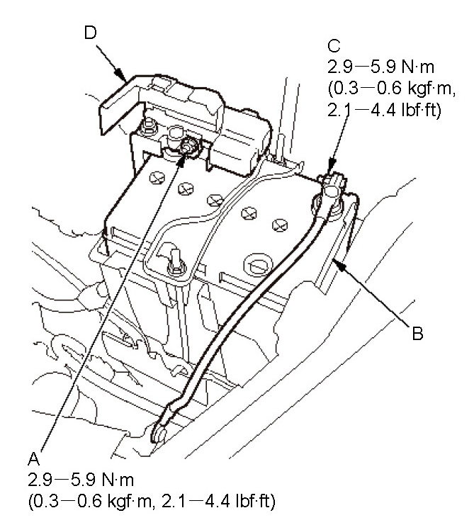 3. Reconnect the positive cable (A) to the battery (B) first, then reconnect the negative cable (C) to the battery.