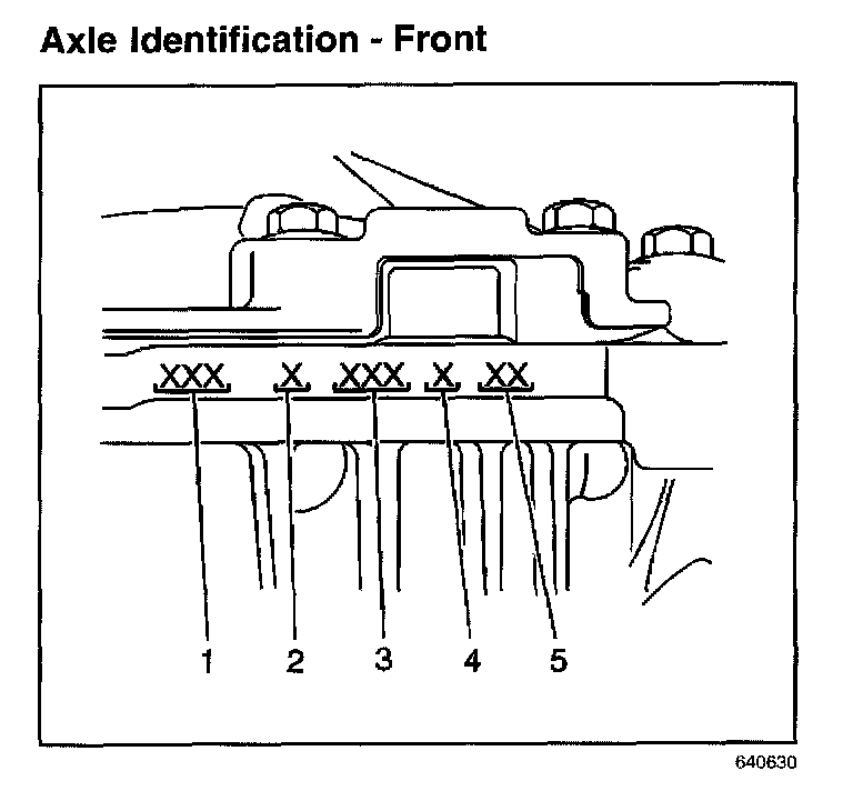 Front axle identification information is stamped on the top of the differential carrier assembly. The information includes the following: