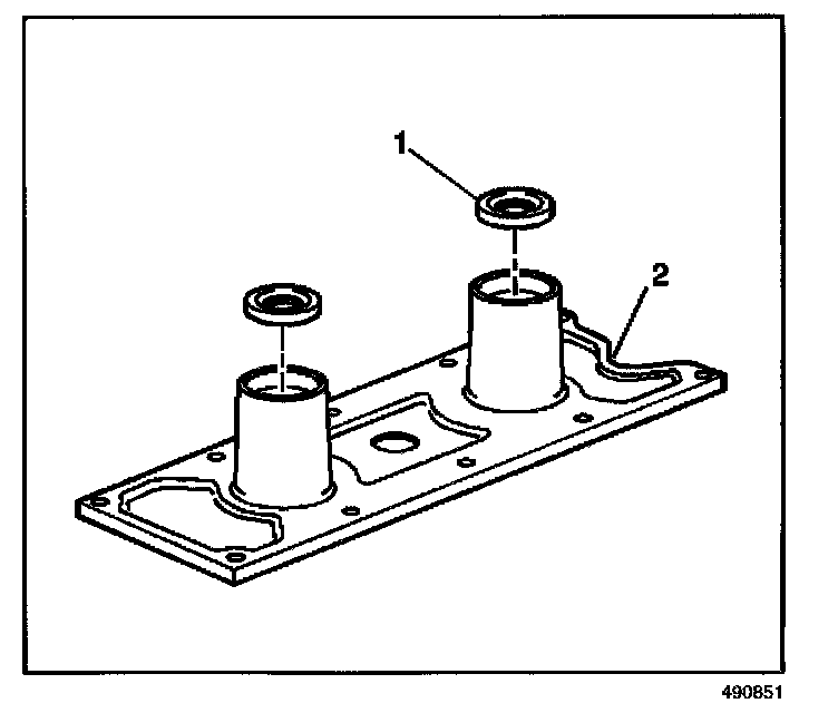 2. Install the knock sensor oil seals (1) into the engine valley cover (2).