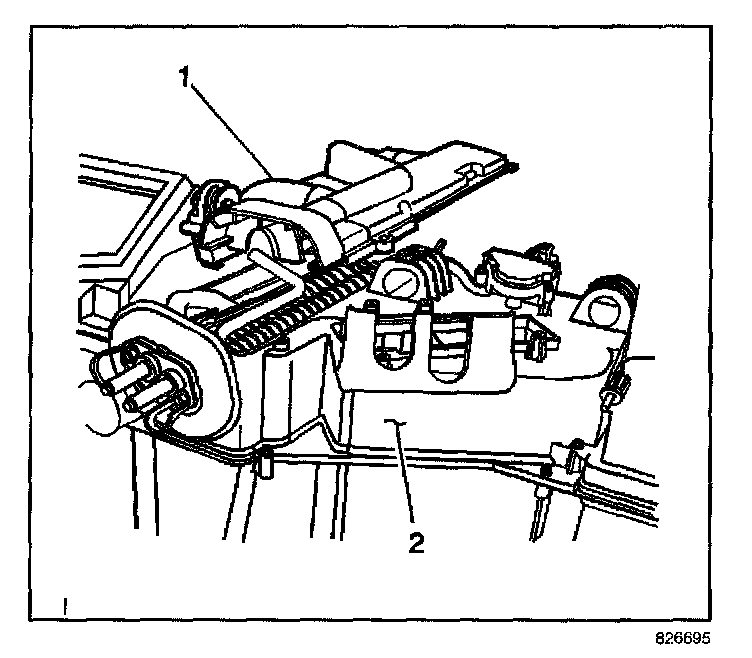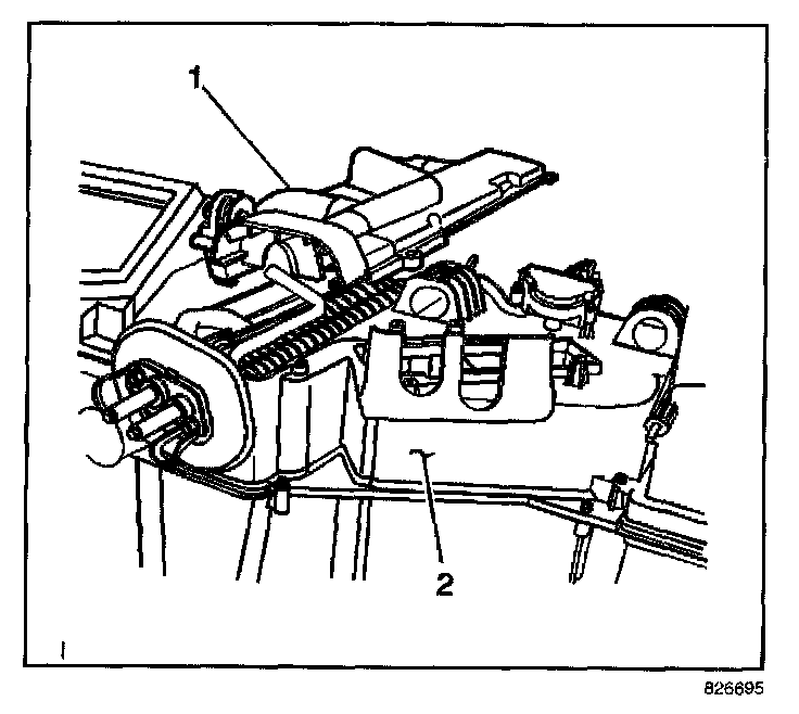 4. Install the evaporator cover (1) to the HVAC module (2).