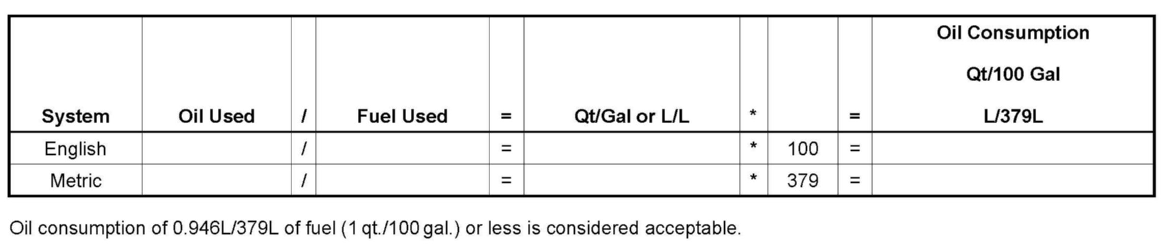 9. If the final evaluation shows that the engine uses more than 0.946 liter (1 qt) in 379 liters (100 gallons) of fuel used, follow the published symptom diagnostics as described in the appropriate Service Manual. If the oil consumption test shows that the engine uses less than 0.946 liter (1 qt) in 379 liters (100 gallons) of fuel used, explain to the customer that their engine meets the guidelines for oil consumption.
