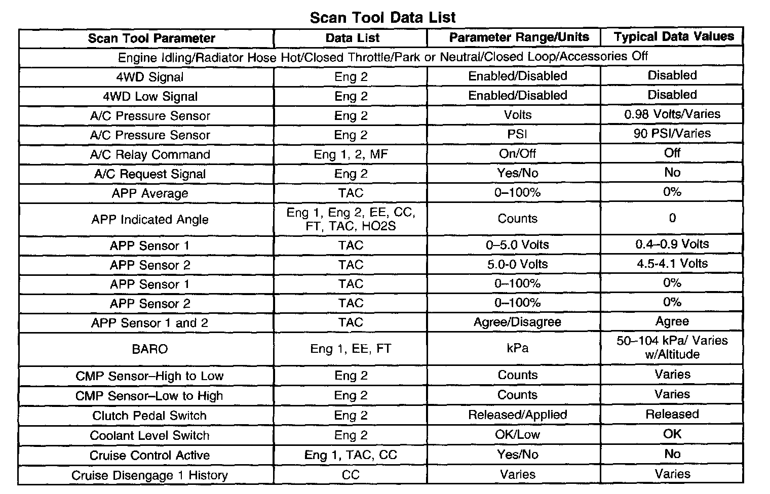 SCAN TOOL DATA LISTThe Engine Scan Tool Data List contains all engine related parameters that are available on the scan tool. The list is arranged in alphabetical order. A given parameter may appear in any one of the data lists, and in some cases may appear more than once, or in more than one data list in order to group certain related parameters together.