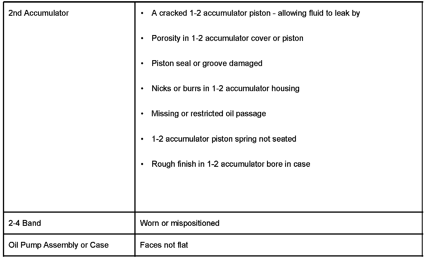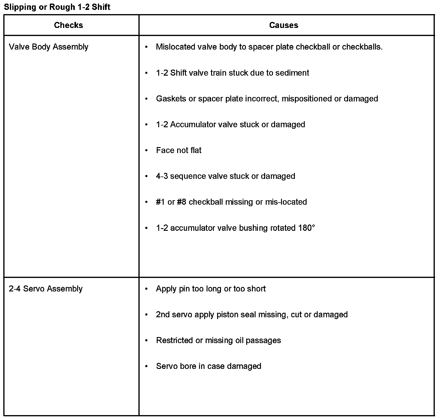 When attempting to correct a consistent harsh 1-2 shift, the four conditions listed above should be inspected as possible causes. It is important to also refer to the appropriate Service Manual for further possible causes of this condition.