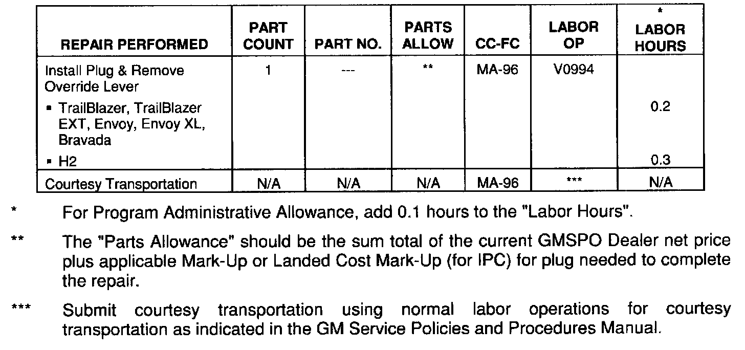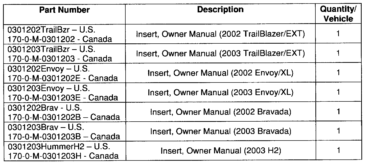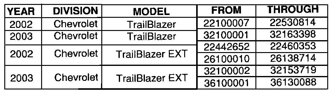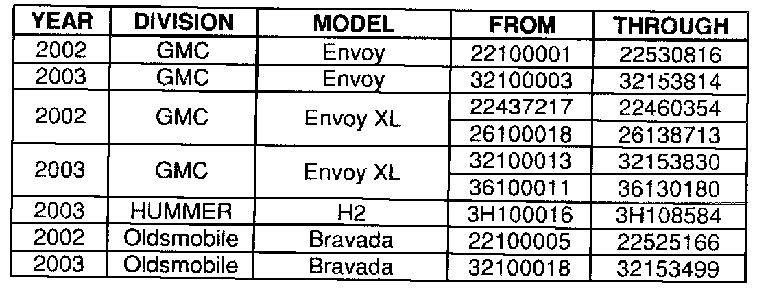 Involved are certain 2002-2003 model year Chevrolet TrailBlazer and TrailBlazer EXI; GMC Envoy and Envoy XL; Oldsmobile Bravada; and 2003 model year HUMMER H2 vehicles built within the VIN breakpoints shown.