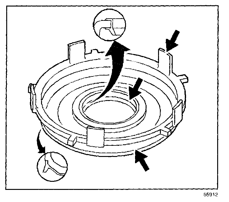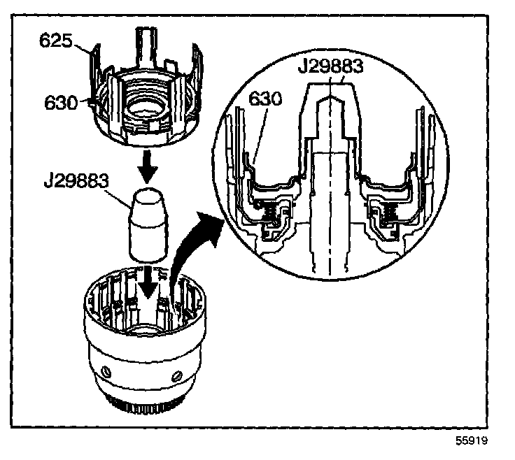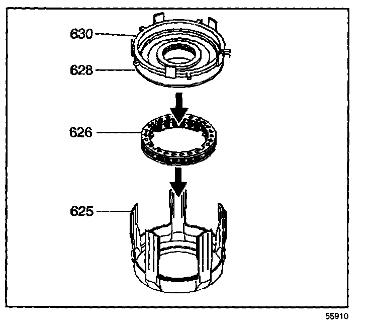 - Hold the assembly by the 3rd and 4th clutch apply ring (625) legs during installation.