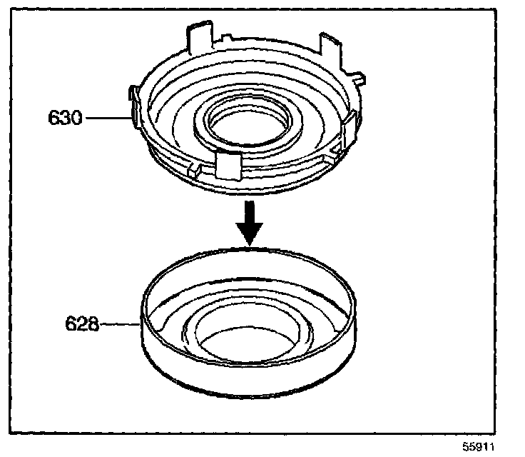 8. Install the forward clutch housing (628) and forward clutch piston (630) into the 3rd and 4th apply ring (625).