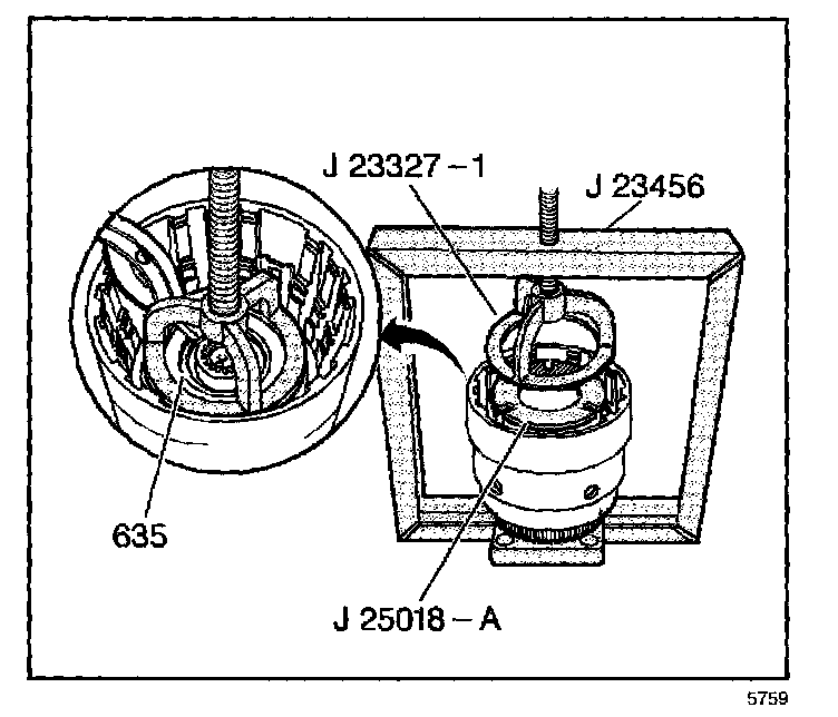 18. Install the J 23327-1 and the J25018-A, and compress the overrun clutch spring assembly using J 23456.