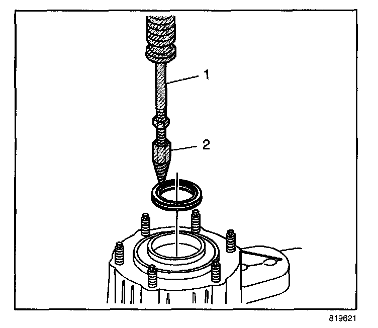 3. Using the J 36825 remove the input shaft seal from the transfer case by threading the self tapping screw (2) into the seal.