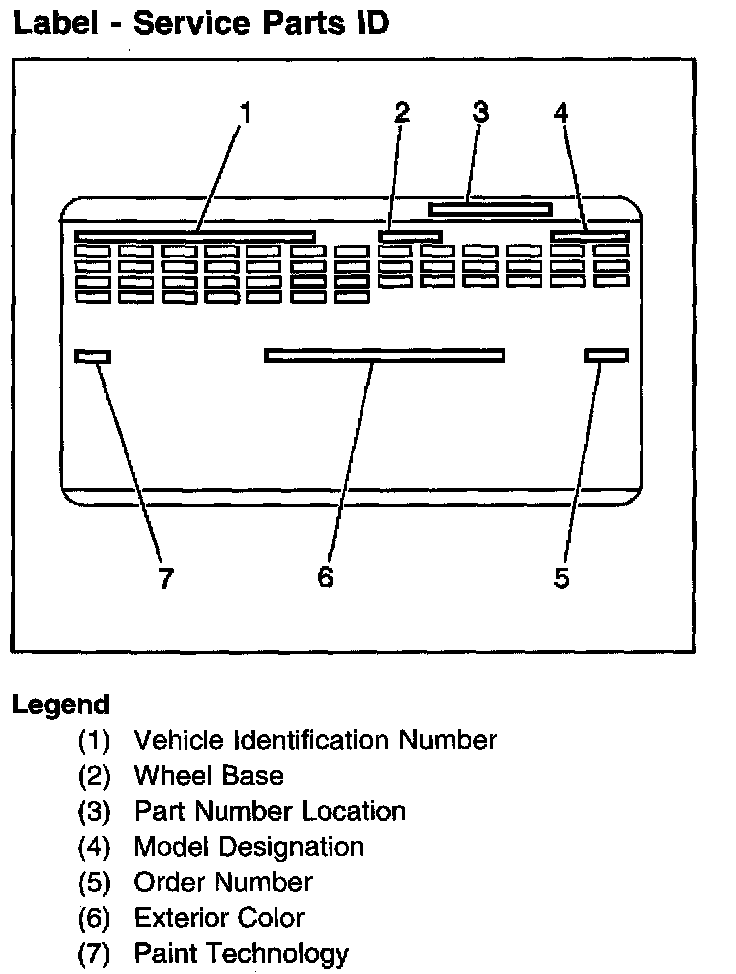 The service parts identification label is placed on the vehicle in order to help the service and parts personnel identify the vehicle's original parts and the vehicle's original options.