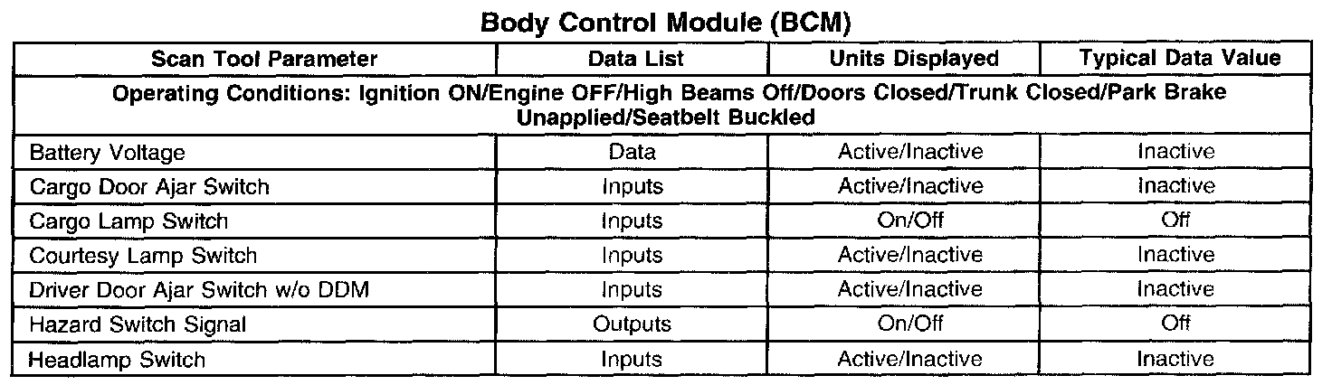 Scan Tool Data List - Body Control Module (BCM) Part 1: