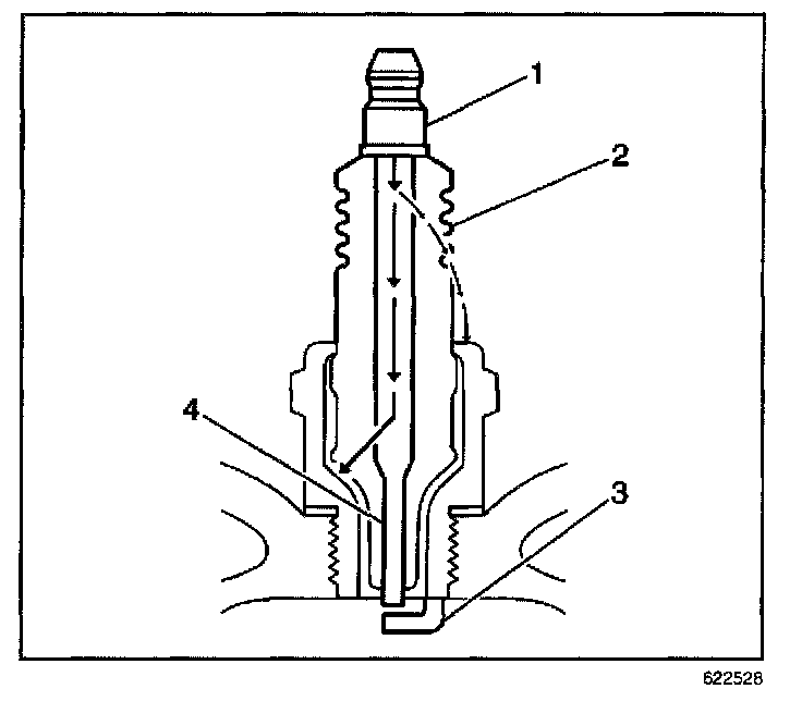 - Inspect the insulator (2) for cracks. All or part of the electrical charge may arc through the crack instead of the electrodes (3, 4).