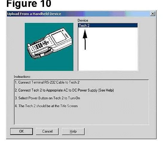 3. Select the top button, "Upload from Handheld" which will launch the screen displayed in Figure 10. Make sure the Tech 2(R) is connected to the computer and plugged in. Select Tech 2(R) under Device and select OK. The screen of your Tech 2(R) should start blinking and a line will start scrolling across the screen indicating it is communicating with your computer.