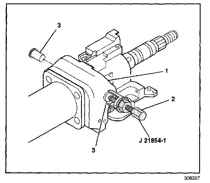 7. Remove the 2 pivot pins (3) from the steering column tilt head assembly (1) using J 21854-01.