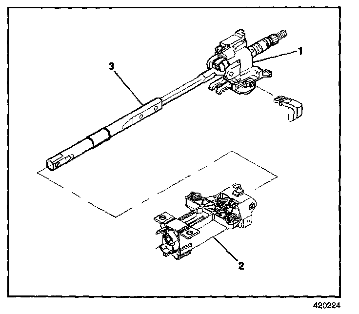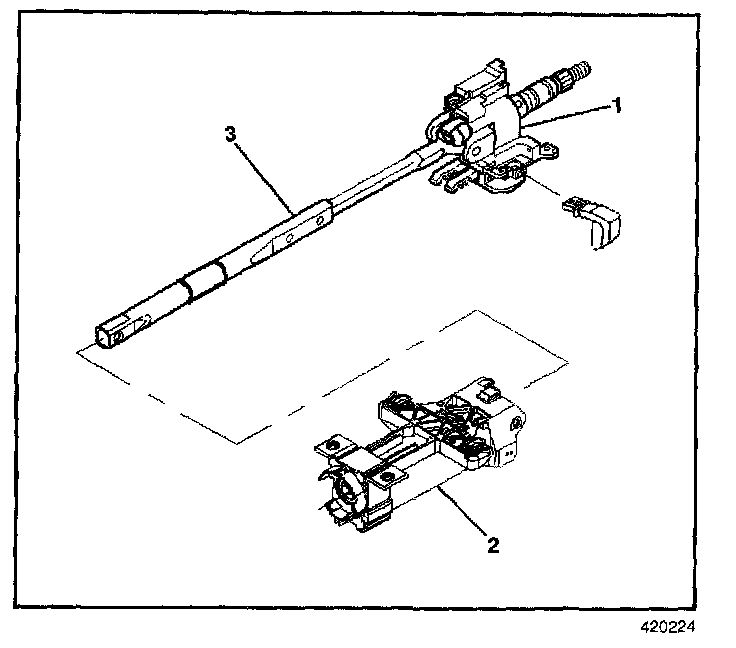 Install the tilt head assembly (1) and the steering shaft (3) into the steering column jacket assembly (2).