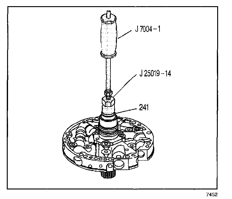 4. Using the J 25019-14 with the J 7004-7, remove the stator shaft rear bushing (241).