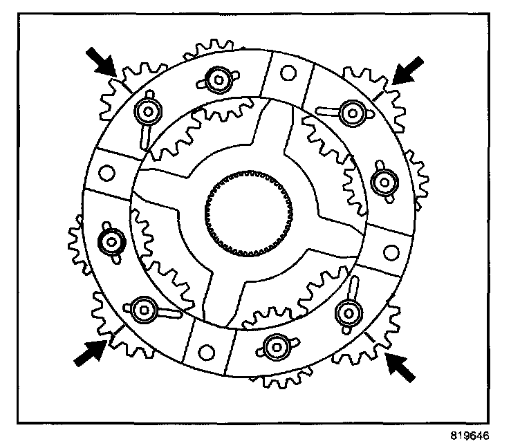 38. With the rear side of the planetary differential facing up, align the marks on the pinion gears. Position the alignment marks with an area on the planetary differential that can be reference for all gears.