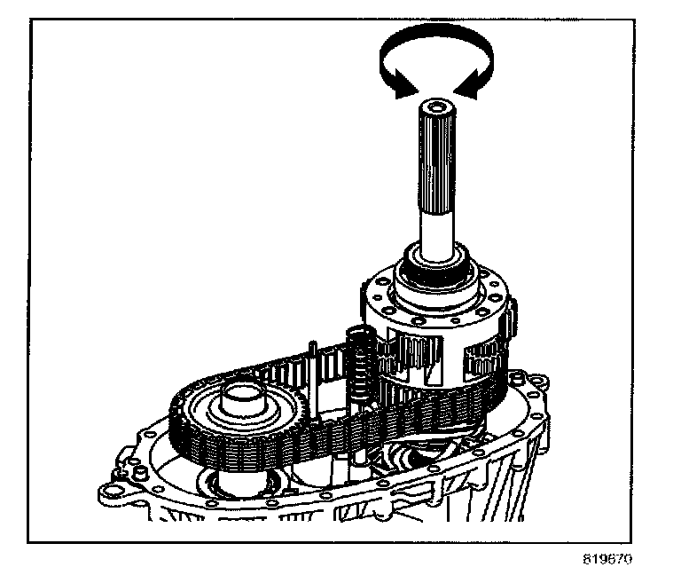 44. Rotate the rear output shaft three or four revolutions to rotate the planetary differential pinion gears. If properly aligned, the pinion gears will rotate freely, there will be no binding.