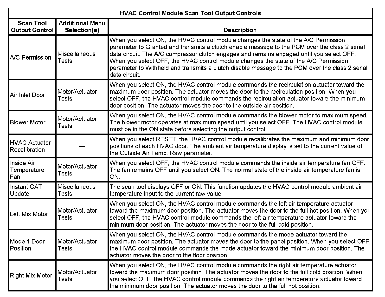 HVAC Control Module Scan Tool Output Controls: