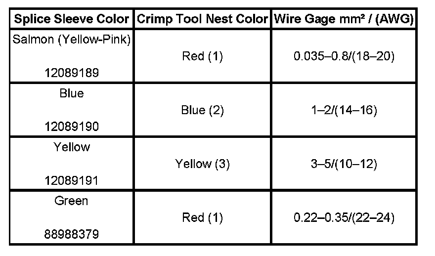 5. Use the Splice Crimp Tool from the J-38125 to crimp duraseal splice sleeve. In order to position the duraseal splice sleeve in the proper color nest of the Splice Crimp Tool, refer to the table at the beginning of this repair procedure.