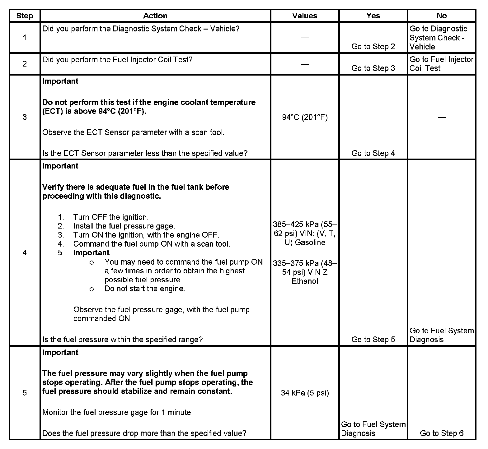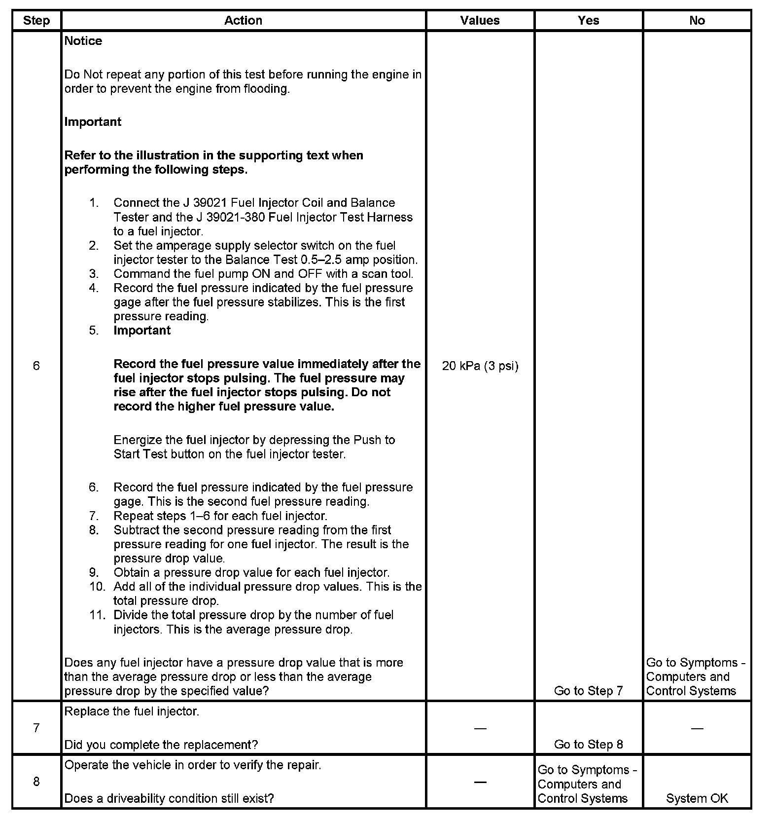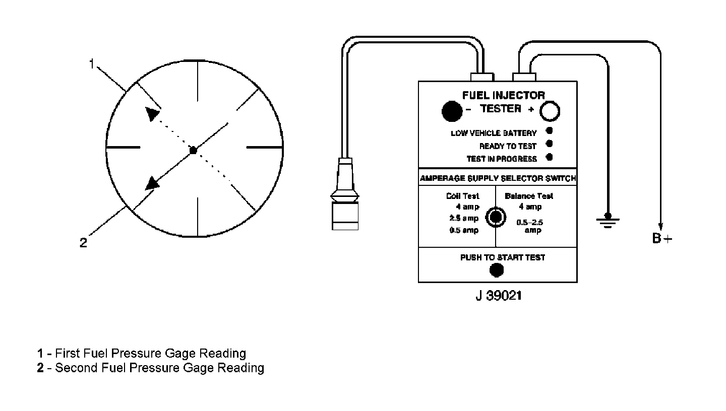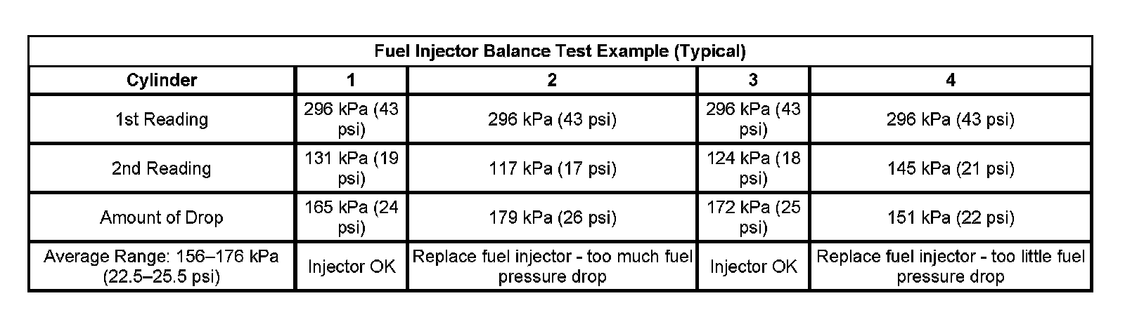 6. If the pressure drop value for each fuel injector is within 10 kPa (1.5 psi) of the average pressure drop value, the fuel injectors are flowing properly. Calculate the pressure drop value for each fuel injector by subtracting the second pressure reading from the first pressure reading. Refer to the illustration.