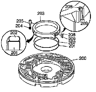 3. Install an O-ring seal (202) and oil seal ring (201) into the groove on the back side of the pump slide (203).