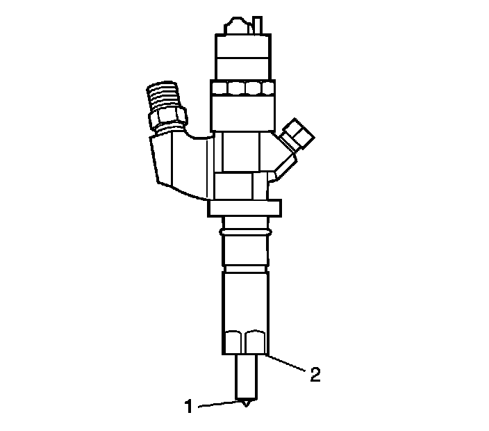 1. Use a soft bristle non-metallic brush and top engine cleaner, GM P/N 1052626 or equivalent, to remove any deposits from the nozzle tip (1) and the copper washer sealing area (2) before re-installation.