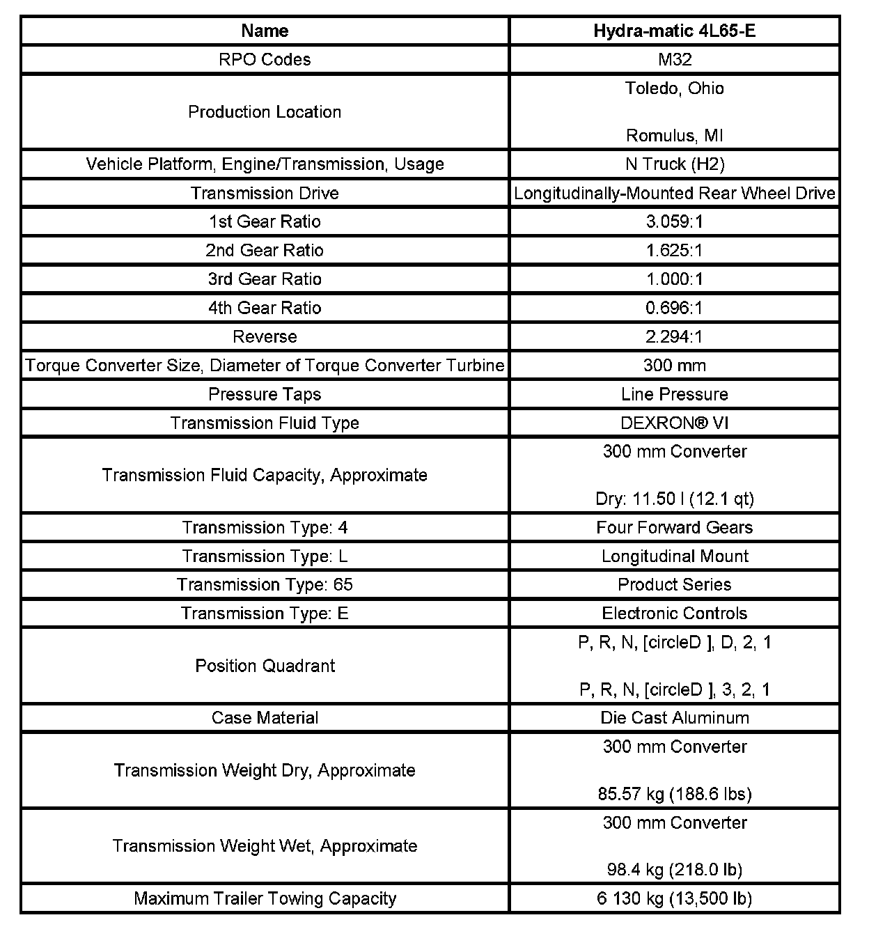 Transmission General Specifications: