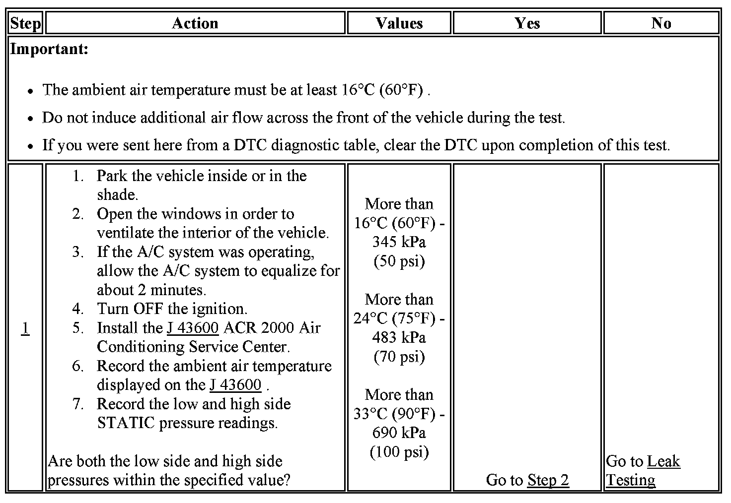 1. This step determines if the A/C system has at least the minimum refrigerant charge required to operate the system without damage.