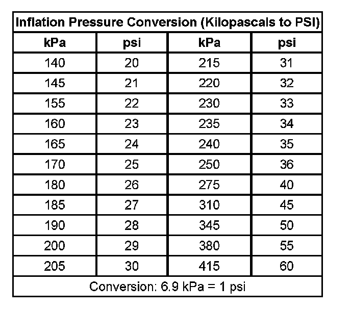 The kilopascal (kPa) is the metric term for pressure. The tire pressure may be printed in both kilopascal (kPa) and psi. One psi equals 6.9 kPa.
