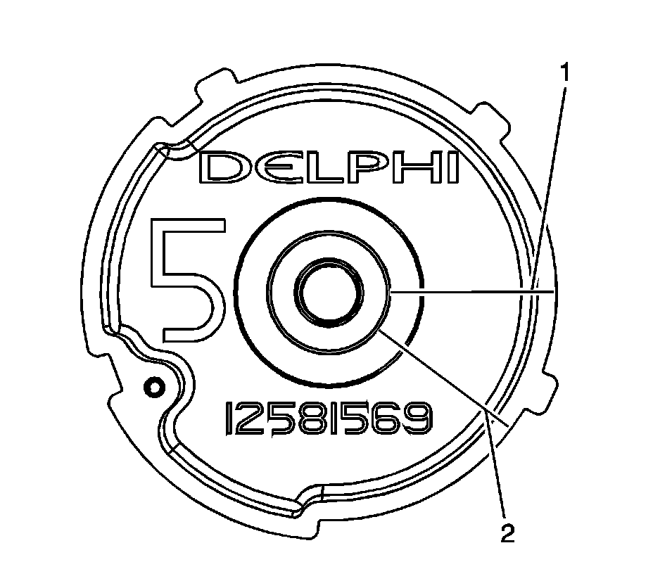 5. Scribe or draw a line (2) on the camshaft position actuator at that position.