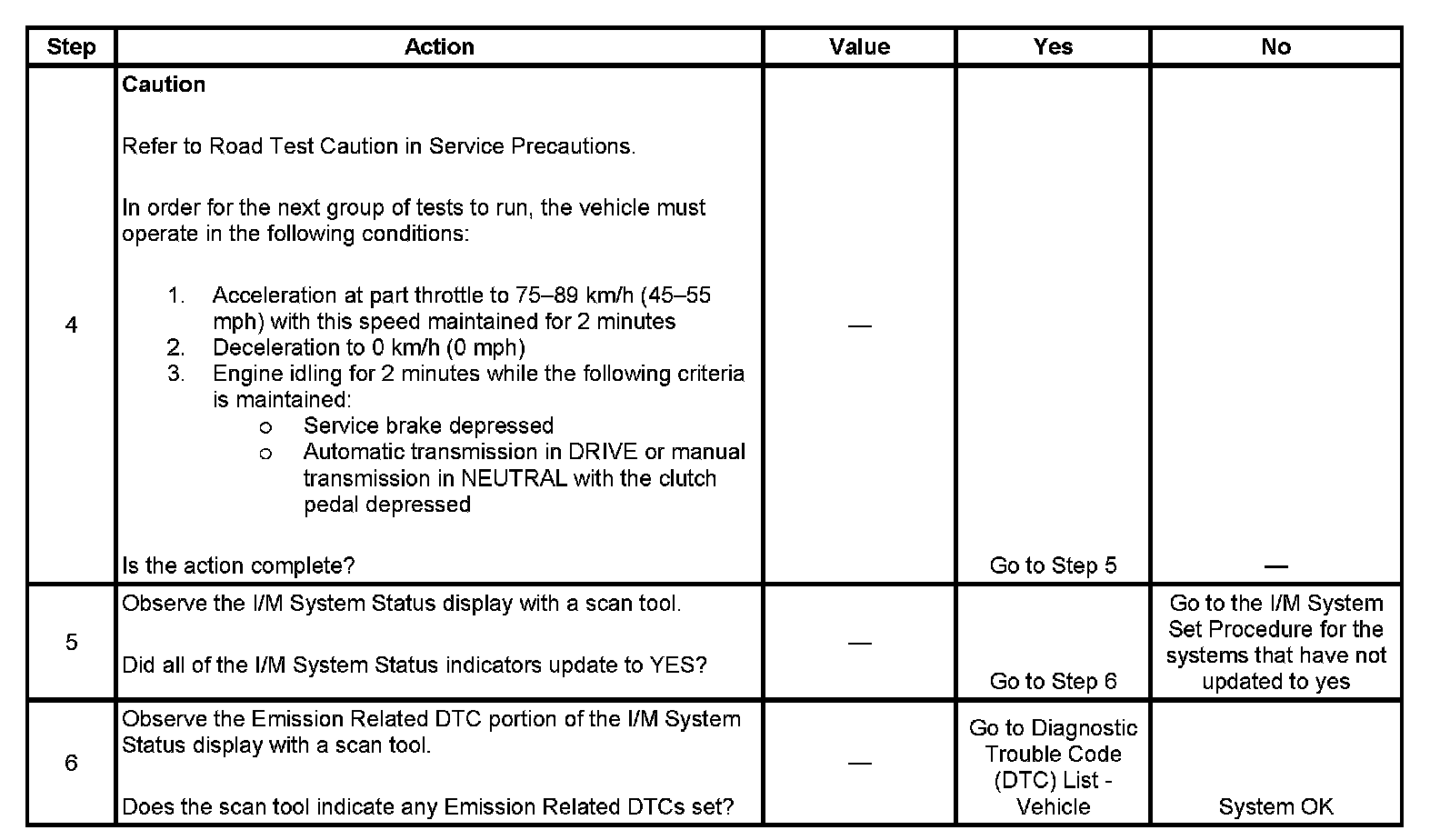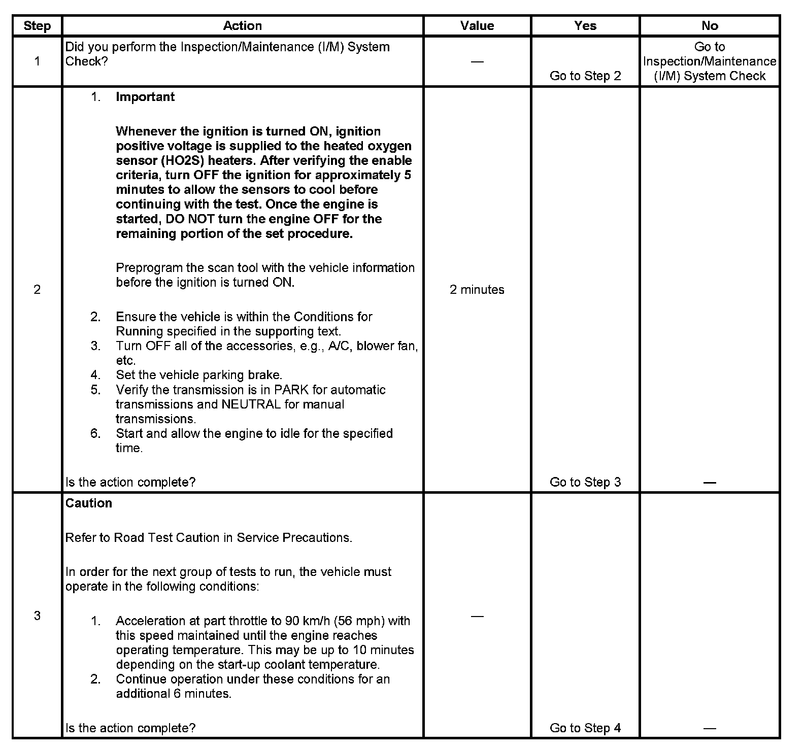The purpose of the inspection/maintenance (I/M) Complete System Set Procedure is to satisfy the enable criteria necessary to execute all of the I/M readiness diagnostics, and complete the trips for those particular diagnostics. When all diagnostic tests are completed, the I/M System Status indicators are set to YES. Perform this procedure when more than one of the I/M System Status indicators are set to NO.