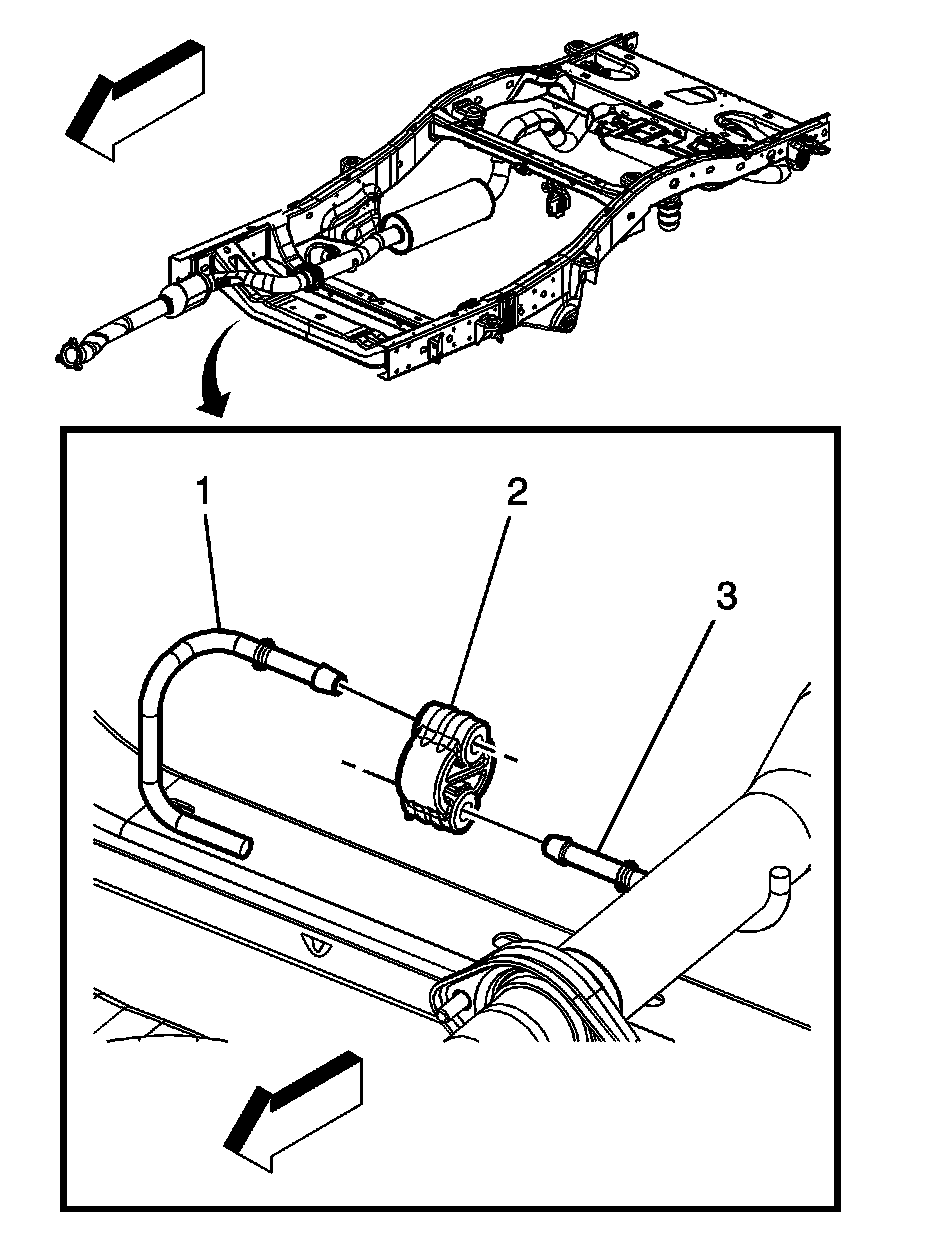 4. Apply a soapy solution to the exhaust muffler hanger rod (3) in order to ease the removal of the exhaust hanger (2), if necessary.