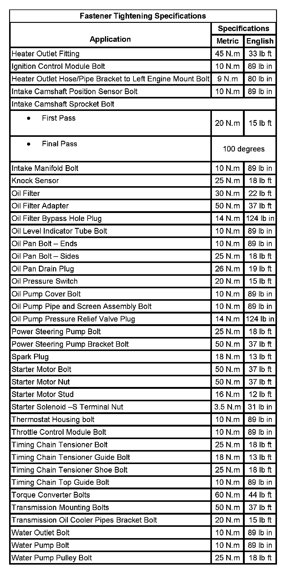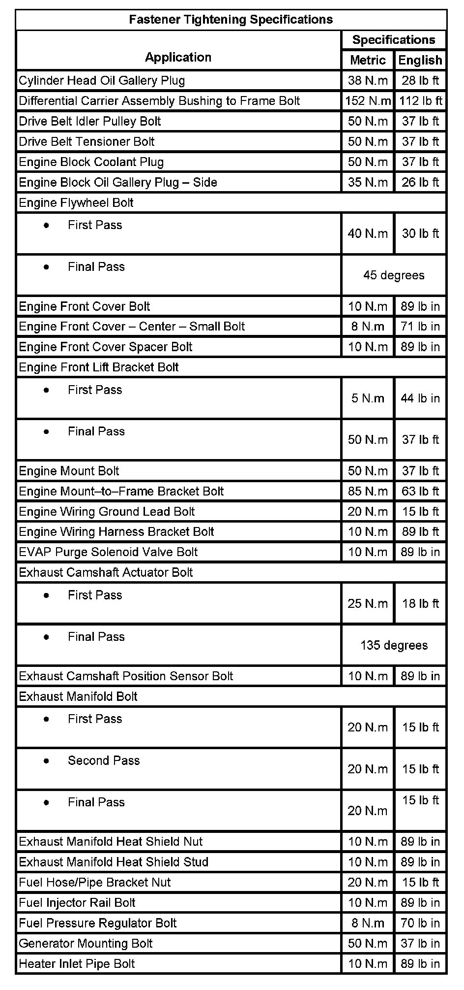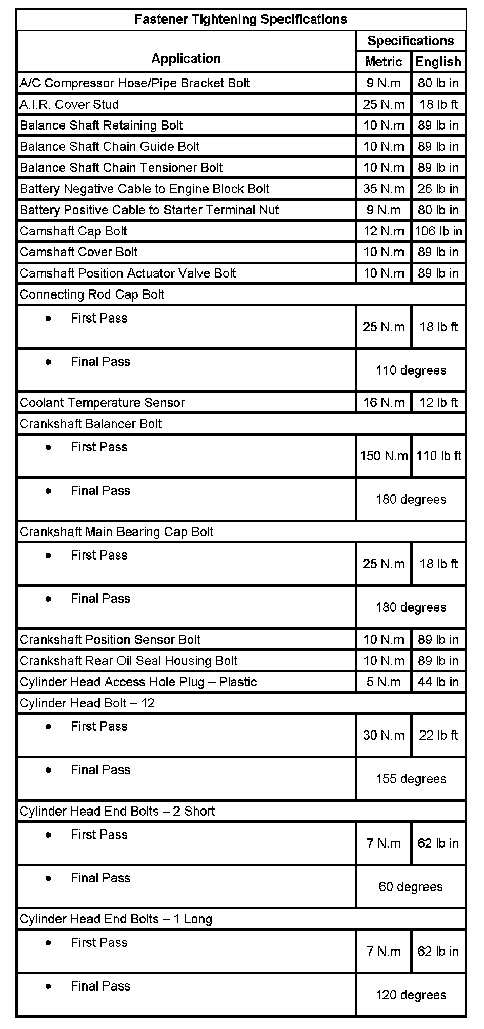 Fastener Tightening Specifications: