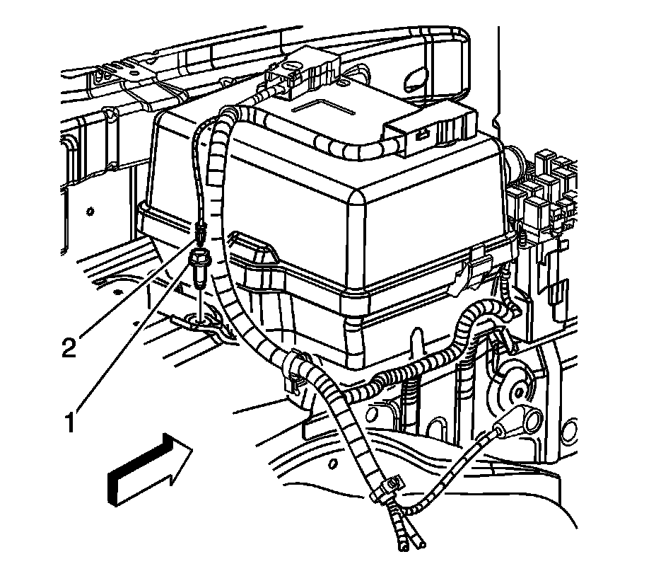 5. Remove the bolt (1) securing the negative battery cable ground (2) to the battery tray.