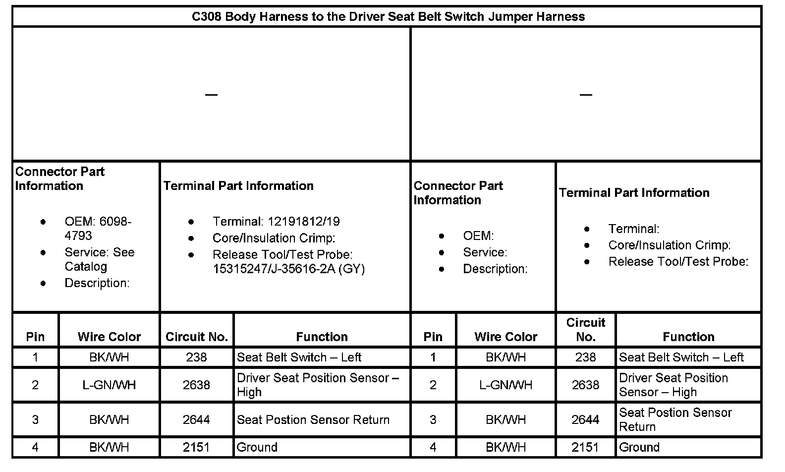 C308 Body Harness To The Driver Seat Belt Switch Jumper Harness:
