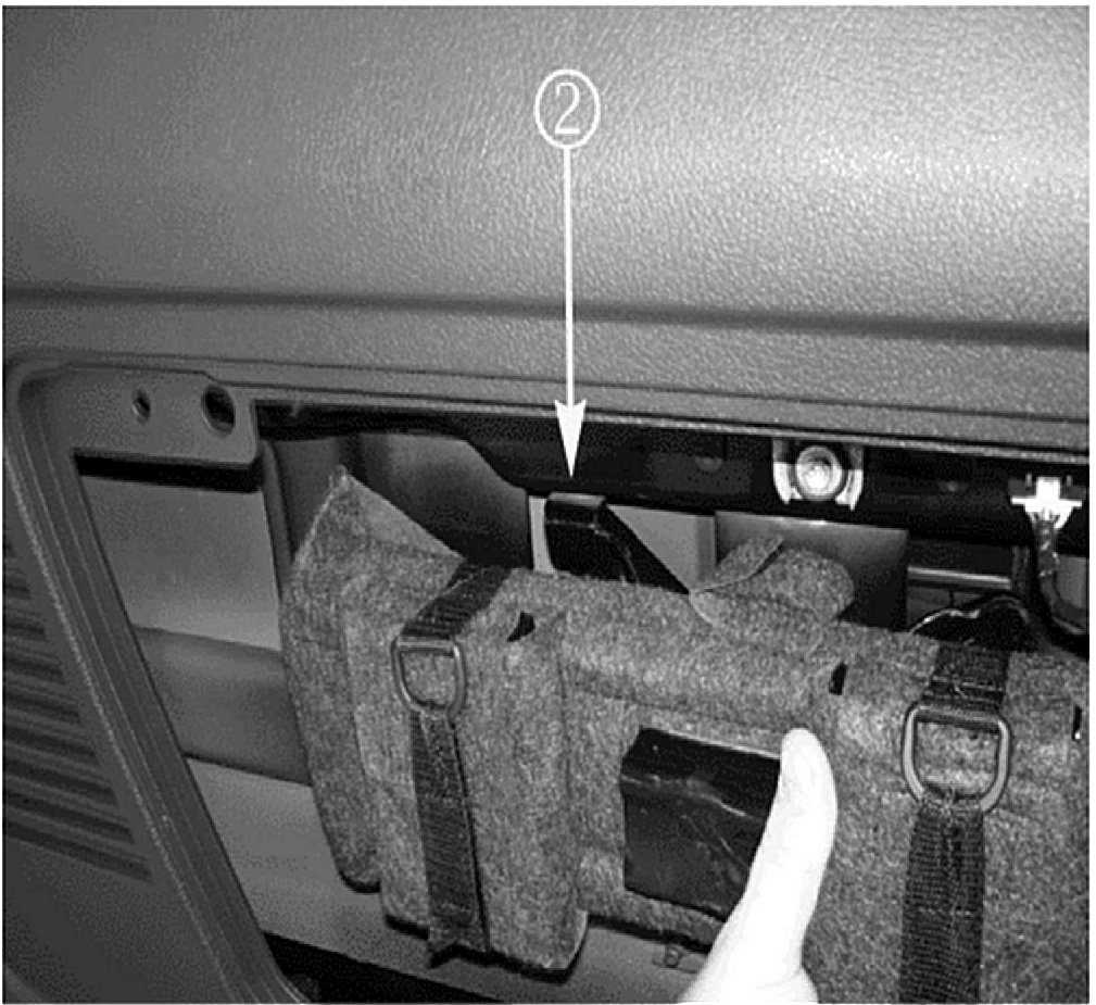 8. Position the jack and jack tool bag in the swing-gate. When reinstalling the jack and jack tool bag, make sure the jack base is securely seated behind (2) the tabs (1) in the swing-gate.