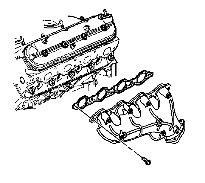 1. Tighten the exhaust manifold bolts a first pass to15 N.m (11 lb ft). Tighten the exhaust manifold bolts beginning with the center 2 bolts. Alternate from side-to-side, and work toward the outside bolts.