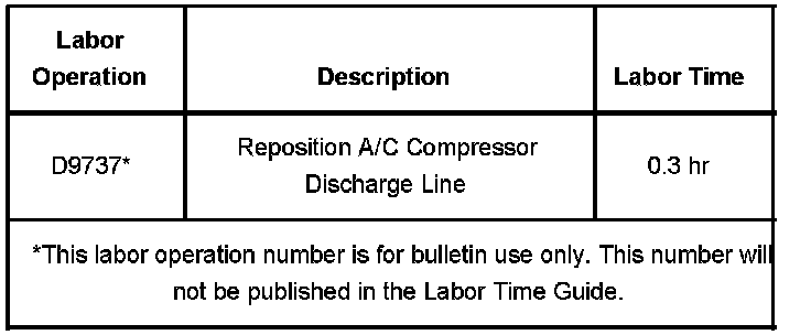 Technicians are to reposition the A/C compressor discharge line as necessary to provide clearance at the right wheelhouse panel. Create a 13 mm (0.50 in) gap between the line and the wheelhouse panel. Do not move the line too far or it may touch the radiator vent hose and possibly restrict fluid flow.
