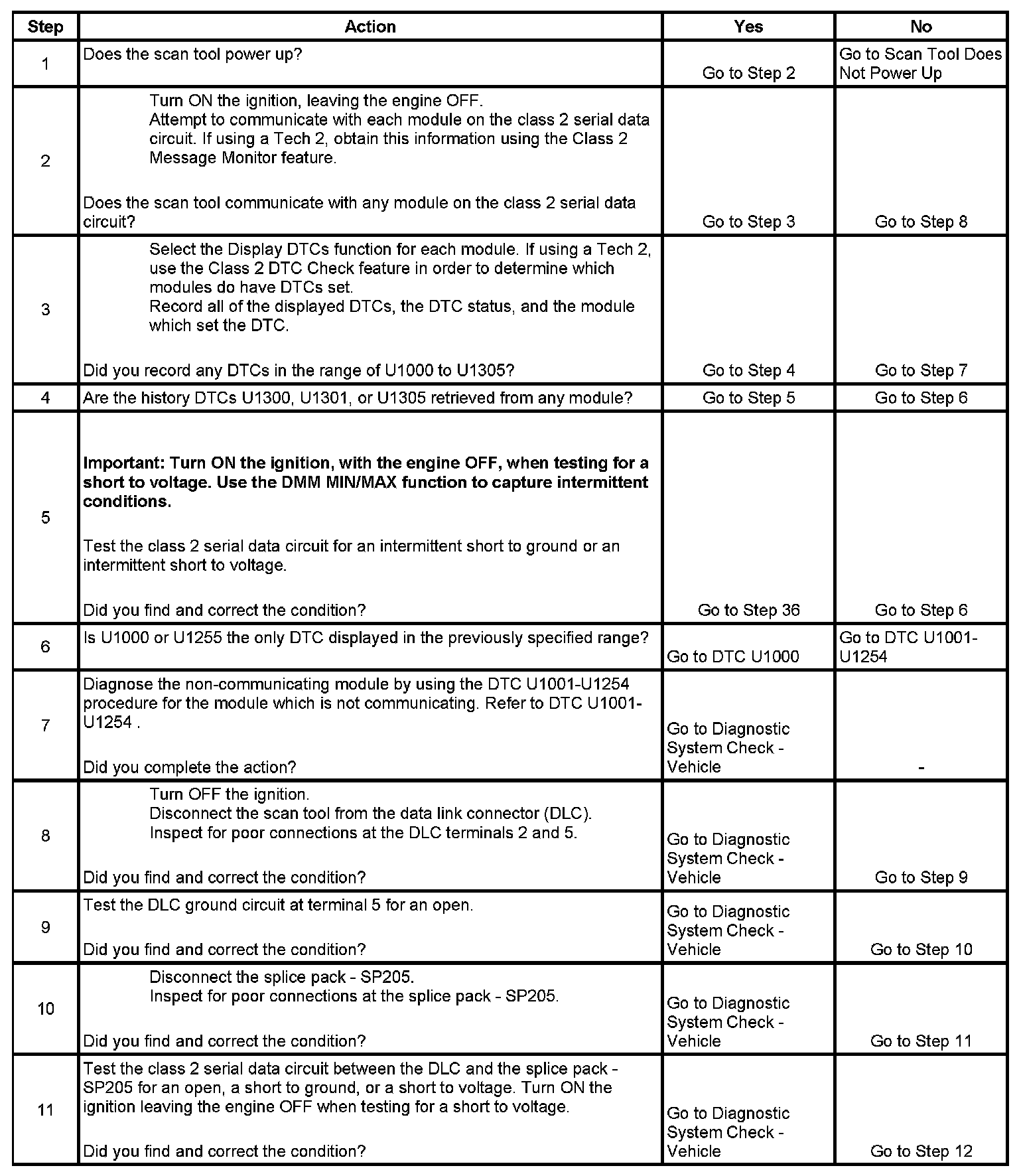 11. An open in the class 2 serial data circuit between the DLC and splice pack - SP205 will prevent the scan tool from communicating with any module. This condition will not set a DTC.