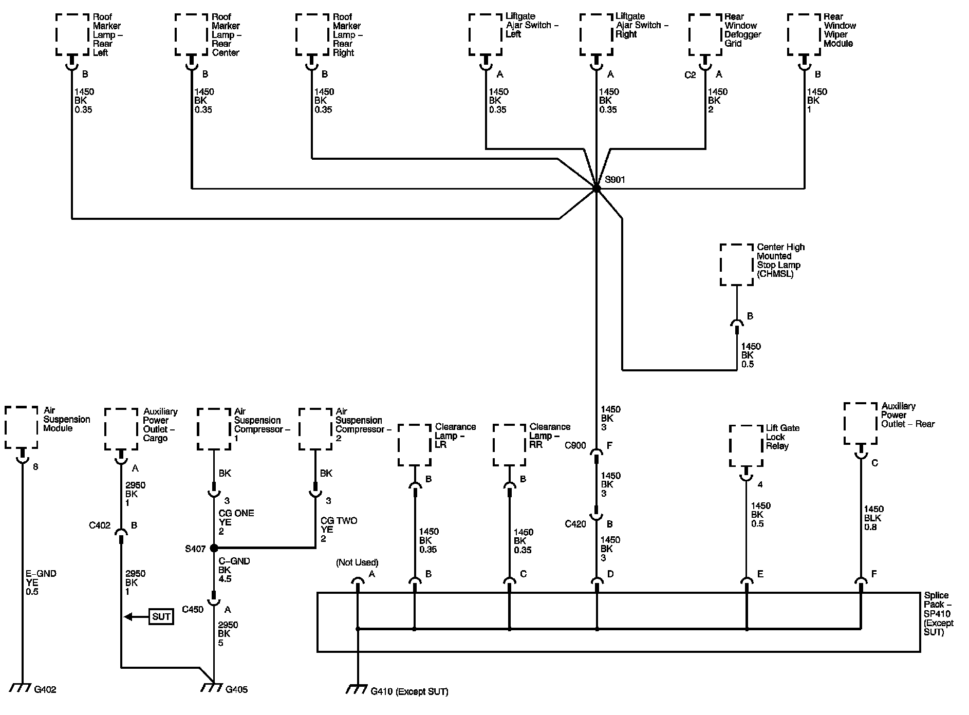 The locations for the Connectors, Grounds, Splices, and Grommets shown within these diagrams can be found via their numbers at Vehicle Locations.